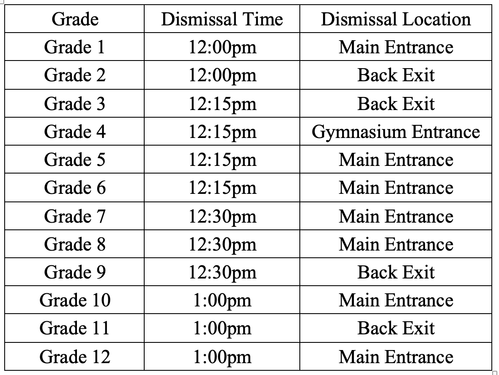 - Parents of Grade 1 to Grade 4 students can pick up their children at the designated doors. Students of other grades can leave school on their own at the designated doors