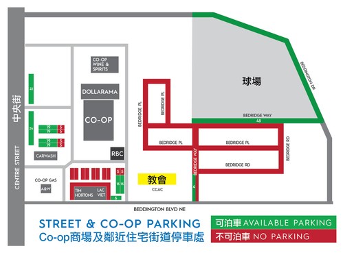 ❶ Co-op商场:为应付主日早上泊车位不足,教会已安排邻近Co-op商场 (8220 Centre St NE) 的停车场作额外泊车之用,请泊图中绿色位置,否则会被票控及拖走